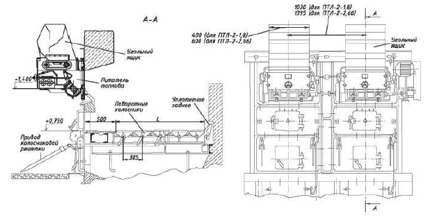 Топка ПТЛ-РПК-2-1800/2135 с ленточными питателями топлива и статичной решеткой с поворотными колосниками. Работает в паре с водогрейными котлами для сжигания каменных и бурых углей.
